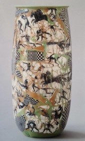 Einer seiner gestalterischen Wege liegt in der Verbindung graphischer Elemente mit den keramischen Objekten. So hat Möhwald eine Umdrucktechnik entwickelt, die es ihm erlaubt, Gedrucktes – Bilder, Muster, Schriftzeichen, Typographien – auf den Ton und unter die Glasur zu bringen. Dabei ist er graphisch-malerisch unterwegs. Seine Vasen und Teller erzählen stumme Geschichten – es sind darauf Bildspuren, meist Fragmente nur, die die zu lesen sind, auf Wege führen, der Erinnerung und Assoziation.